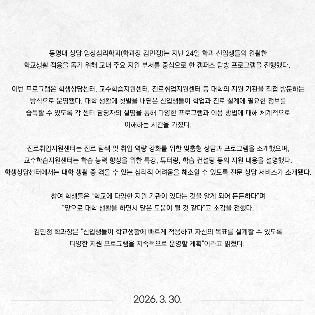 “신입생 대학생활 첫걸음 지원” 동명대 상담·임상심리학과 캠퍼스 탐방